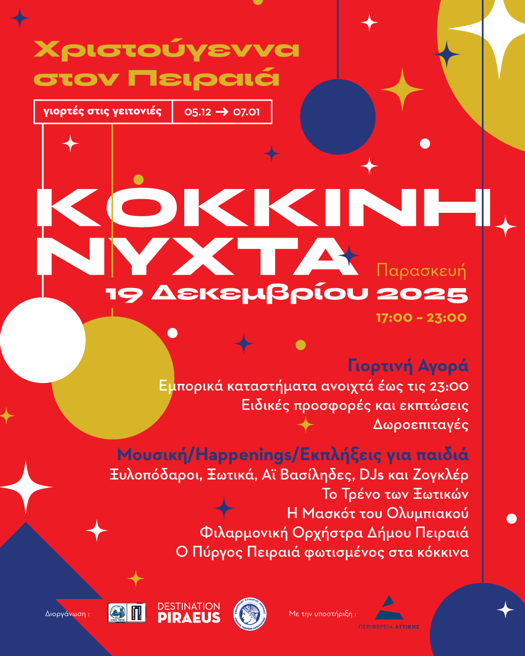Ο Πειραιάς φορά τα γιορτινά του και σας προσκαλεί στη «Κόκκινη Νύχτα», μια μοναδική Χριστουγεννιάτικη γιορτή που θα γεμίσει την πόλη με φως, μουσικές και κέφι!